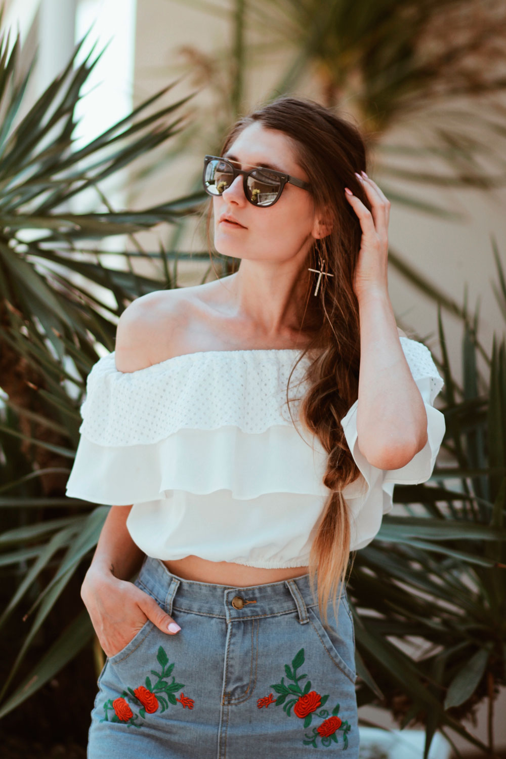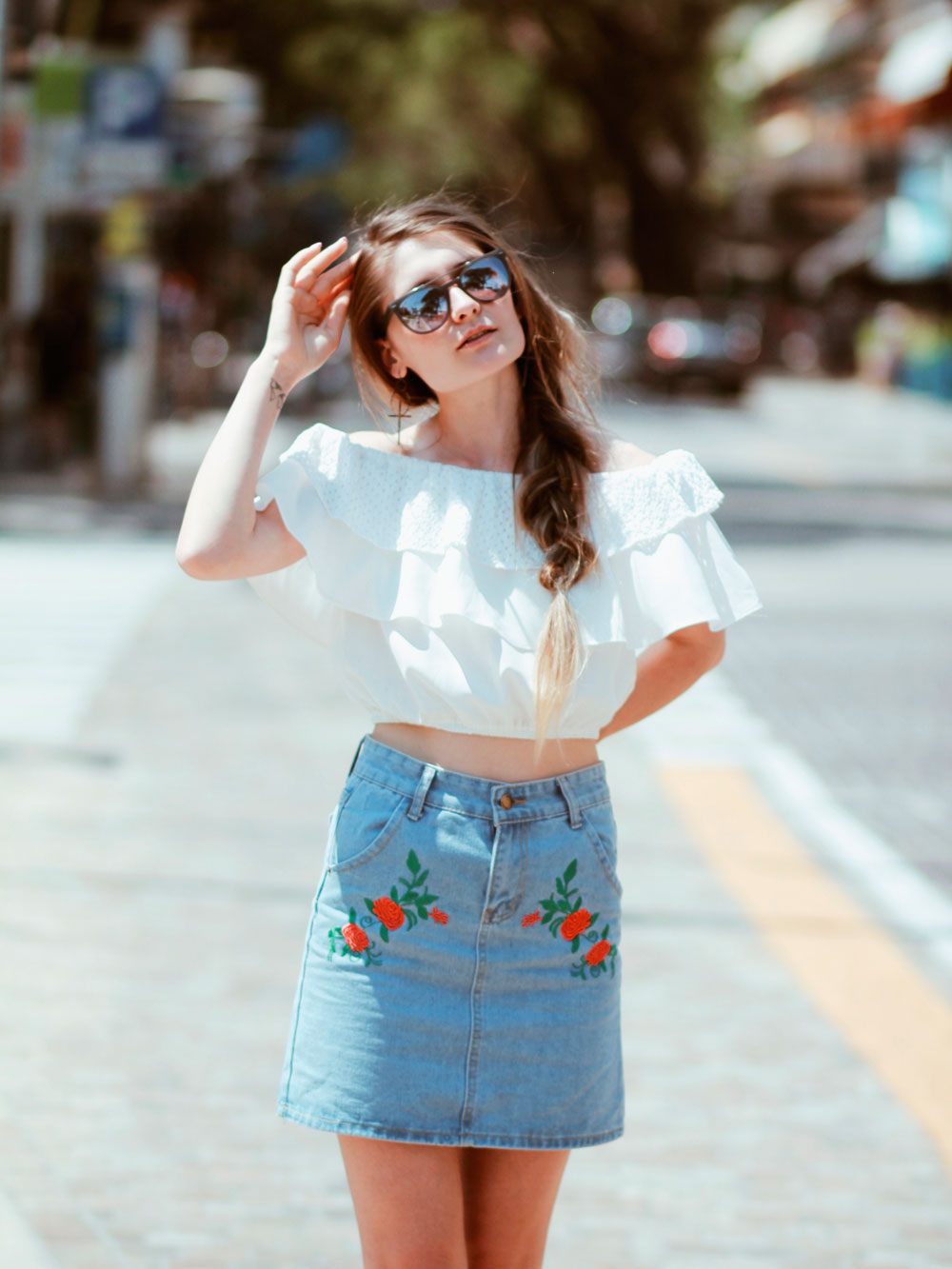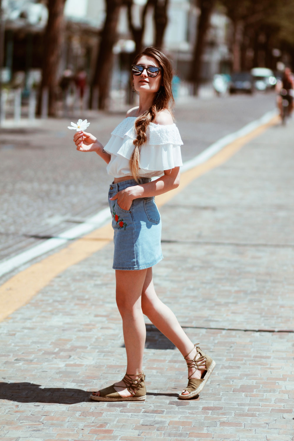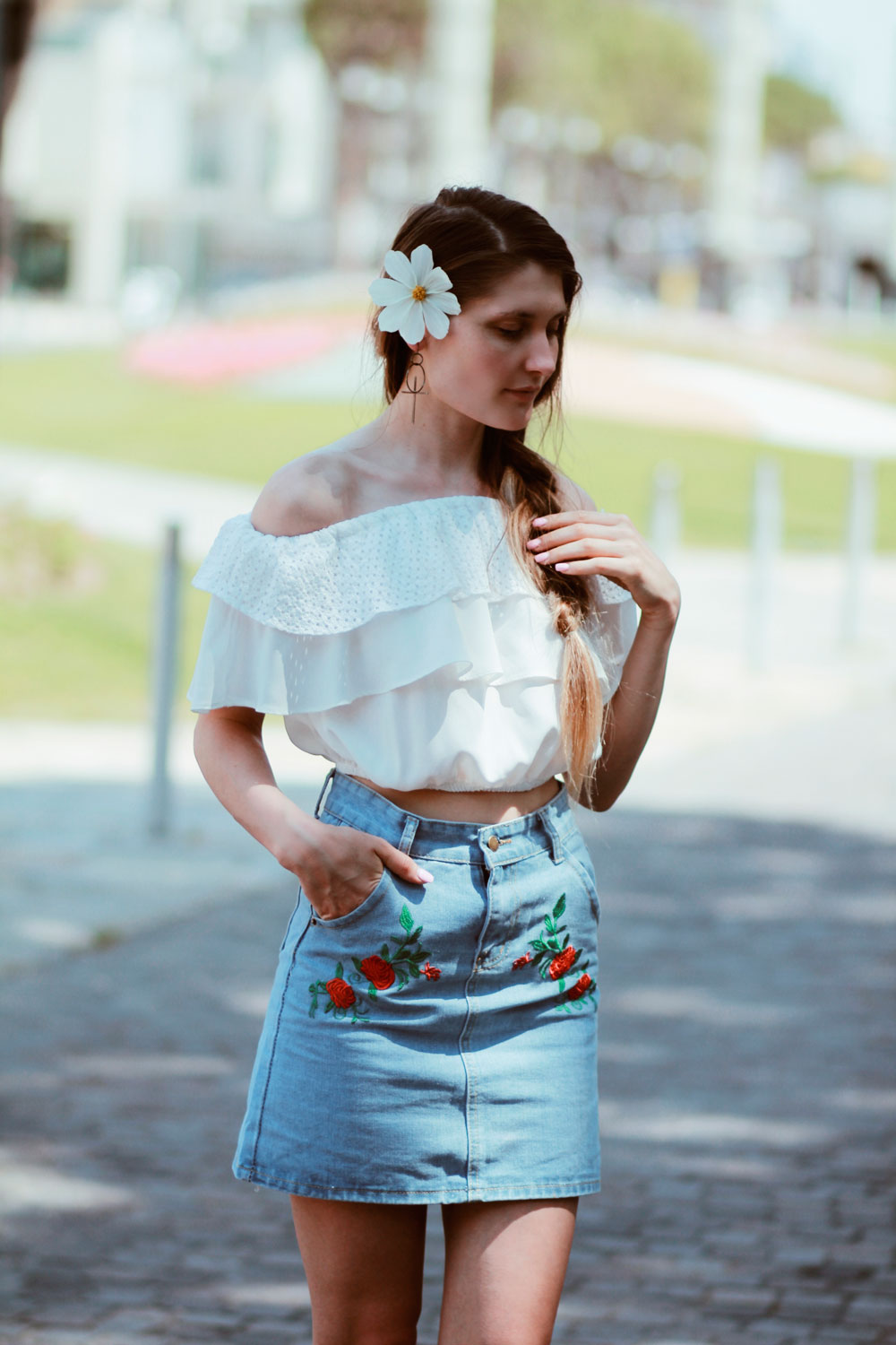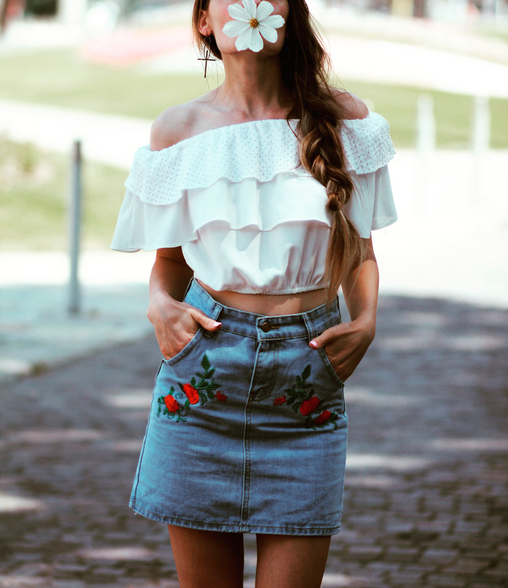 Ce mai faceti voi? Sper ca bine?! Abia asteptam acest weekend si uite ca e aproape Vineri 🙂 Saptamana aceasta am plecat la mare si m-am intors rosie ca un rac 😀 Sunt prea alba ca sa devin deodata ciocolata :)) Ahhh cat va invidiez pe voi,cele cu un bronz superb catifelat 🙂 Poate,poate pana in august sper si eu sa mai prin culoare ahahhah. Pana una alta o sa va vorbesc despre aceasta tinuta,o tinuta foarte simpla,de vara. Pentru a ma simti comod am ales sa port un top cu umerii goi,tare mult imi plac astfel de piese.Sunt frumoase,super comode si tare stylish.Plus ca le putem asorta atat de usor! Pentru a evidentia aceasta tinuta,am optat pentru o fusta denim cu detalii florale.Stiu ca si voua v-a placut mult 🙂 Ca sa fiu sincera,mi-a fost foarte greu sa aleg aceasta fusta,pentru ca pe site sunt atat de multe si toate,absolut toate sunt wow 😀 Vedeti aici si o sa va convingeti si voi de acest lucru 🙂